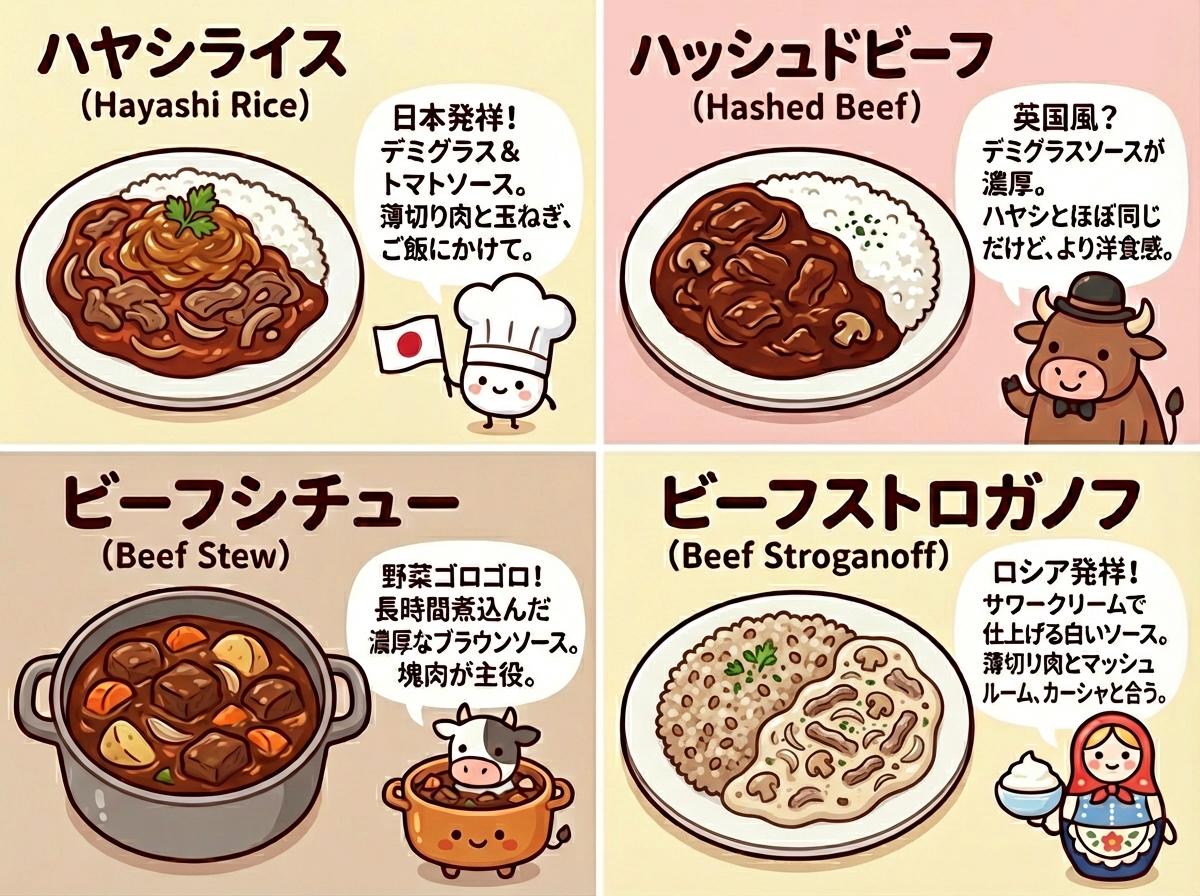 ハヤシライス・ハッシュドビーフ・ビーフシチュー・ビーフストロガノフってどう違うの?