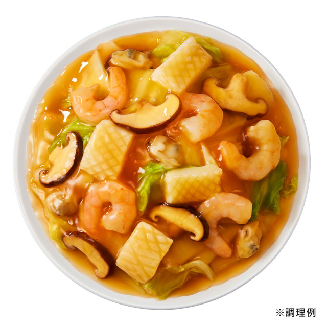 | 原材料 | 調味だれ【しょうゆ(国内製造)、水あめ、果糖ぶどう糖液糖、食塩、カキエキス、鶏がらスープ、醸造酢、XO醤、にんにく、生姜、ホタテエキス、こしょう、酵母エキス/酒精、調味料(アミノ酸等)、カラメル色素、増粘剤(キサンタン)】 とろみ粉【でん粉(タイ製造)、小麦粉、デキストリン、乾燥全卵、食塩/加工デンプン、微粒二酸化ケイ素】 |