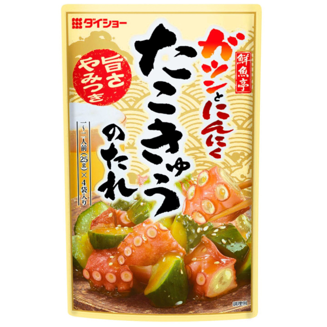 TOP>> Seasoning 調味料 鮮魚亭 ガツンとにんにく たこきゅうのたれ 価格: ¥243 (税込) ~ ¥1,620 (税込) [ポイント還元 2ポイント~] 販売期間: 数量: 選択してください 1: 1袋セット (1袋 243円) 2: 2袋セット(1袋あたり 約216円) 5: 5袋セット(1袋あたり 約189円) 10: 10袋セット(1袋あたり 約162円) 価格と在庫を一覧で確認する 価格: - 数量: セット 数量価格在庫1: 1袋セット (1袋 243円)¥243(税込)在庫あり2: 2袋セット(1袋あたり 約216円)¥432(税込)在庫あり5: 5袋セット(1袋あたり 約189円)¥945(税込)在庫あり10: 10袋セット(1袋あたり 約162円)¥1,620(税込)在庫あり お買い上げ商品の返品交換、および免責事項について レビューはありません 商品説明 醤油ににんにくの風味をしっかり効かせ、アクセントに赤唐辛子とごま油の風味を加えた、たこきゅうのたれです。 ※たこきゅうとは、タコときゅうりを使ったおつまみメニューです。 鮮魚亭 ガツンとにんにく たこきゅうのたれ 価格: ¥243 (税込) ~ ¥1,620 (税込) [ポイント還元 2ポイント~] 販売期間: 数量: 選択してください 1: 1袋セット (1袋 243円) 2: 2袋セット(1袋あたり 約216円) 5: 5袋セット(1袋あたり 約189円) 10: 10袋セット(1袋あたり 約162円) 価格と在庫を一覧で確認する 価格: - 数量: セット 数量価格在庫1: 1袋セット (1袋 243円)¥243(税込)在庫あり2: 2袋セット(1袋あたり 約216円)¥432(税込)在庫あり5: 5袋セット(1袋あたり 約189円)¥945(税込)在庫あり10: 10袋セット(1袋あたり 約162円)¥1,620(税込)在庫あり お買い上げ商品の返品交換、および免責事項について レビューはありません 商品仕様 商品番号 47611 商品名 鮮魚亭 ガツンとにんにく たこきゅうのたれ 内容量 100g(25g×4袋) 原材料 水あめ(国内製造)、しょうゆ、にんにく、食塩、砂糖、醸造酢、ごま油、発酵調味料、乾燥にんにく、かつおエキス、赤唐辛子、酵母エキス/酒精、増粘剤(加工デンプン、キサンタン)、調味料(アミノ酸等)、カラメル色素 アレルギー情報 小麦・ごま・大豆